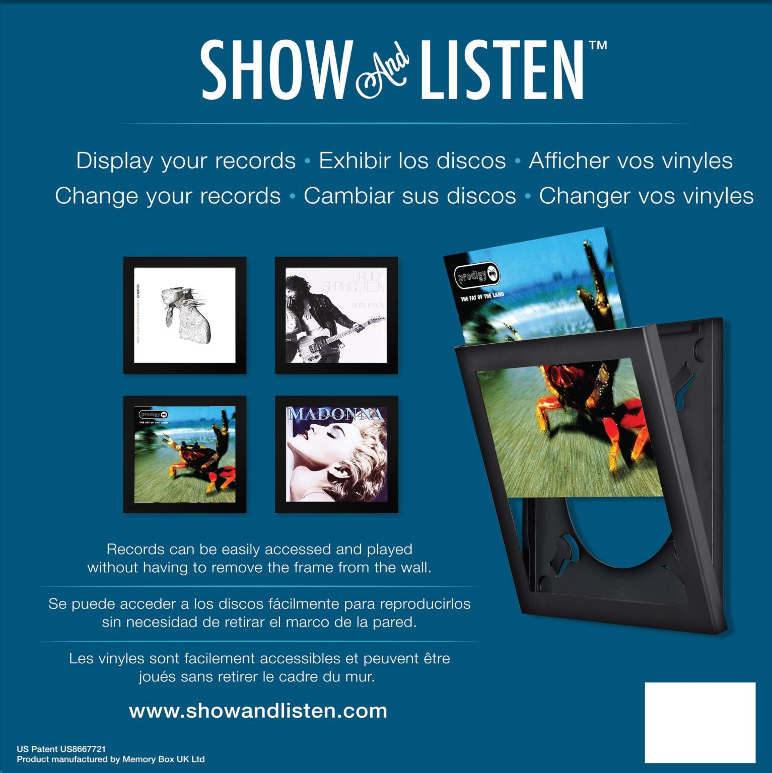 The Show & Listen Record Frame is the only display frame that allows music lovers to display their artwork and easily change the contents without removing the frame from the wall.