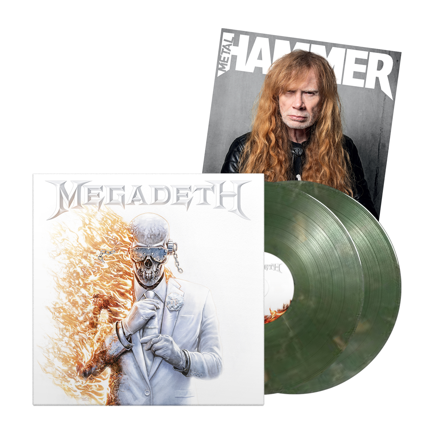 This bundle features a limited-edition Megadeth x Metal Hammer cover and the Copper/Emerald Marble Vinyl of their final album.