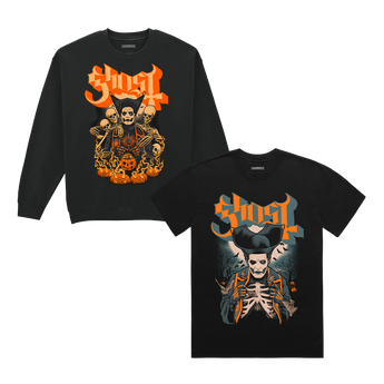 Celebrate spooky season in style with this official Ghost T-shirt and Sweatshirt bundle. The T-shirt is printed on black cotton, showcasing a haunting illustration of Papa Emeritus in skeletal attire, surrounded by bats, jack-o’-lanterns, and eerie woods. The black sweatshirt features Ghost’s Papa Emeritus in a bold Halloween-inspired design with skulls and flames.